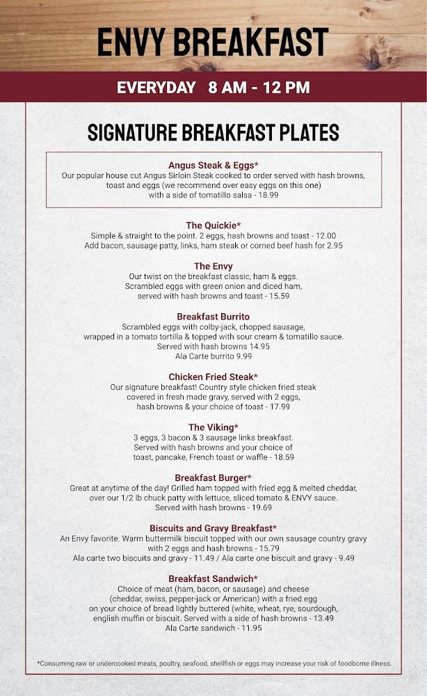 The menu at Envy Bar and Grill features a wide range of options to cater to various tastes. It includes appetizers like Loaded Nachos and Envy Wings, perfect for sharing.