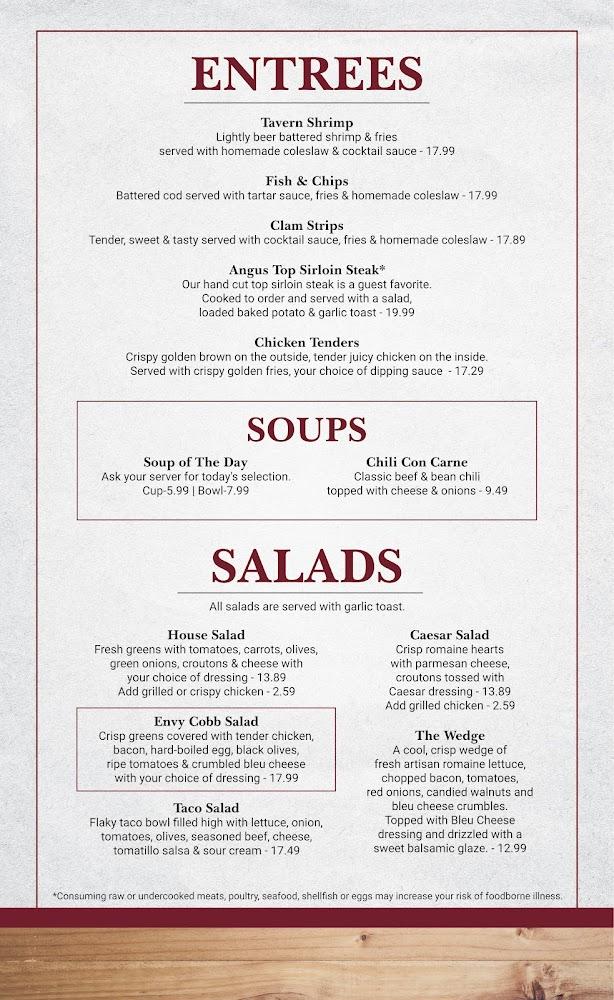 Entrees showcase classic American dishes. Try the Angus Top Sirloin Steak or the tavern-style Fish & Chips. Vegetarians can enjoy crisp salads, including the Envy Cobb Salad and Caesar Salad.