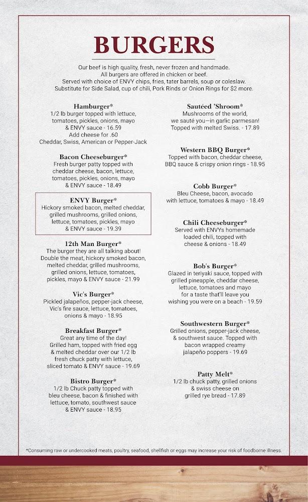 Burgers are a highlight, with choices like the Envy Burger and the 12th Man Burger. Each burger pairs well with the restaurant's local beer selection.